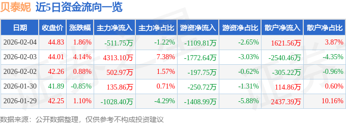 2月4日的资金流向数据方面,主力资金净流出511.75万元,占总成交额1.22%,游资资金净流出1109.81万元,占总成交额2.65%,散户资金净流入1621.56万元,占总成交额3.87%。