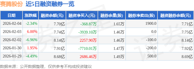 证券之星消息,截至2026年2月4日收盘,赛腾股份(603283)报收于48.83元,下跌2.34%,换手率3.04%,成交量8.25万手,成交额4.03亿元。