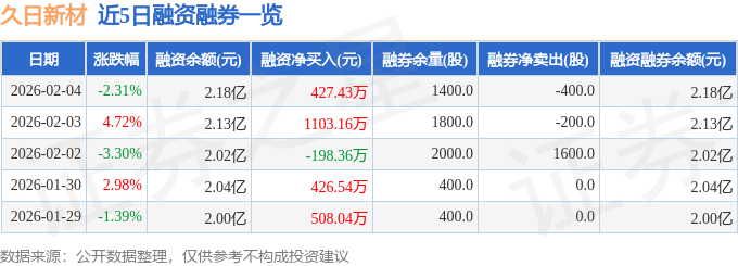 久日新材融资融券信息显示,融资方面,当日融资买入1538.34万元,融资偿还1110.91万元,融资净买入427.43万元。融券方面,融券卖出1400.0股,融券偿还1800.0股,融券余量1400.0股,融券余额3.73万元。融资融券余额2.18亿元。