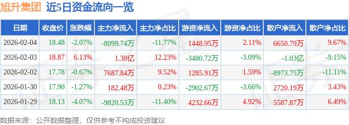 证券之星消息,截至2026年2月4日收盘,旭升集团(603305)报收于18.48元,下跌2.07%,换手率3.2%,成交量37.0万手,成交额6.88亿元。