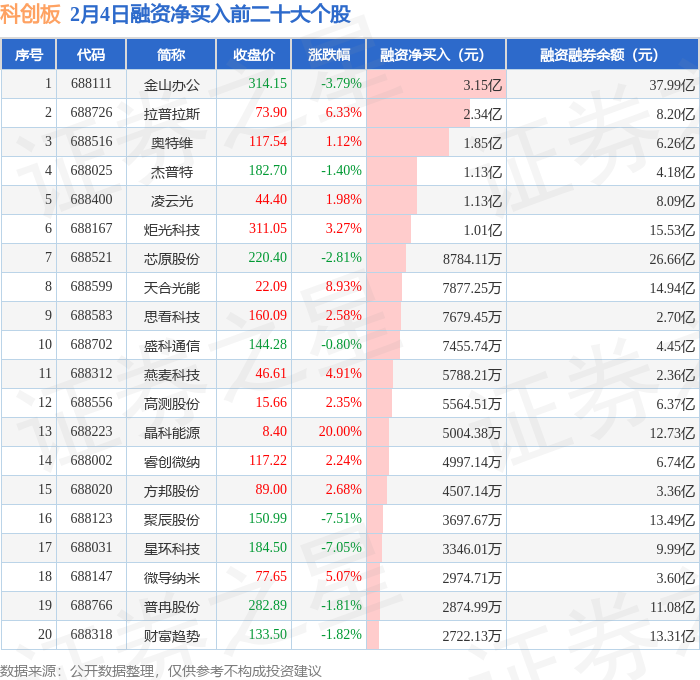科创板融资净买入前三分别为:金山办公(688111)融资净买入3.15亿元、拉普拉斯(688726)融资净买入2.34亿元、奥特维(688516)融资净买入1.85亿元,前20具体见下表: