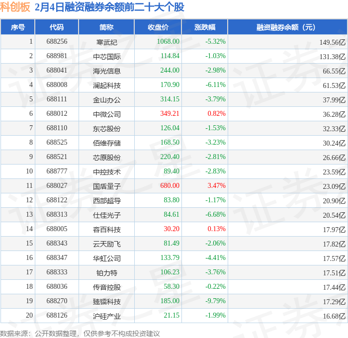 科创板融资融券余额前三分别为:寒武纪(688256)融资融券余额149.56亿元、中芯国际(688981)融资融券余额131.38亿元、海光信息(688041)融资融券余额66.55亿元,前20具体见下表: