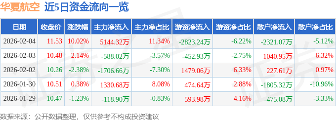 证券之星消息,截至2026年2月4日收盘,华夏航空(002928)报收于11.53元,上涨10.02%,涨停,换手率3.19%,成交量40.8万手,成交额4.54亿元。