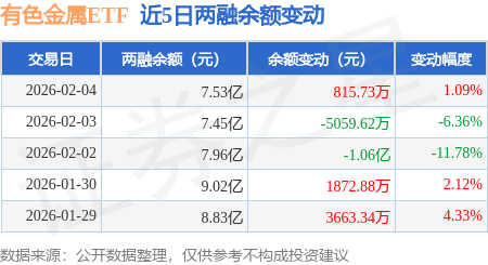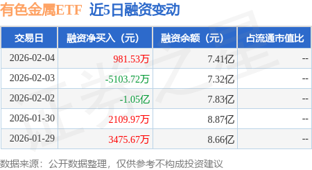 证券之星消息,2月4日,有色金属ETF(512400)融资买入1.13亿元,融资偿还1.03亿元,融资净买入981.53万元,融资余额7.41亿元,近20个交易日中有15个交易日出现融资净买入。