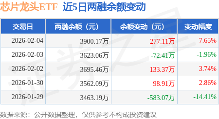 证券之星消息,2月4日,芯片龙头ETF(516640)融资买入809.26万元,融资偿还532.15万元,融资净买入277.11万元,融资余额3900.17万元。