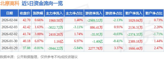 2月4日的资金流向数据方面,主力资金净流入1960.5万元,占总成交额1.4%,游资资金净流出2989.53万元,占总成交额2.13%,散户资金净流入1029.04万元,占总成交额0.73%。