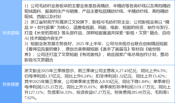 该股为影视,短剧/互动影游,纺织服装概念热股,当日影视概念上涨2.77%,短剧/互动影游概念上涨1.69%,纺织服装概念上涨1.1%。