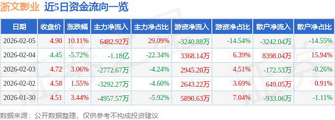 证券之星消息,浙文影业2月5日涨停收盘,收盘价4.9元。该股于9点32分涨停,未打开涨停,截止收盘封单资金为1.89亿元,占其流通市值3.32%。