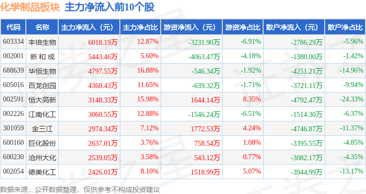 从资金流向上来看,当日化学制品板块主力资金净流出12.76亿元,游资资金净流入3.74亿元,散户资金净流入9.02亿元。化学制品板块个股资金流向见下表: