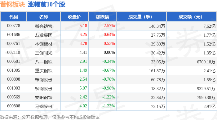 证券之星消息,2月5日普钢板块较上一交易日下跌1.41%,杭钢股份领跌。当日上证指数报收于4075.92,下跌0.64%。深证成指报收于13952.71,下跌1.44%。普钢板块个股涨跌见下表: