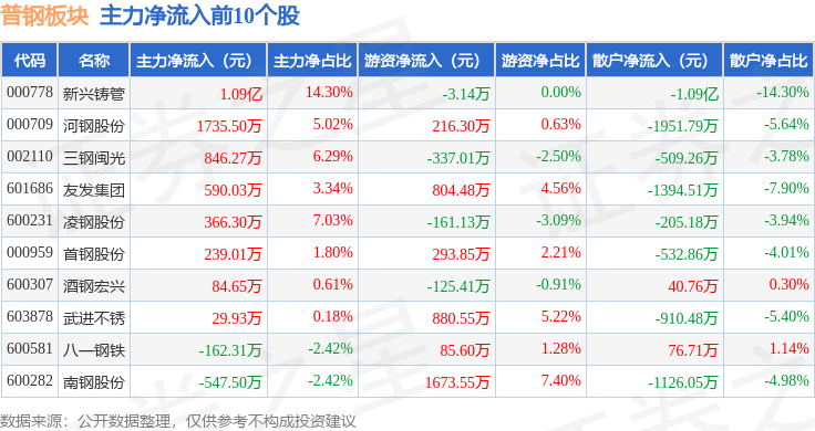 从资金流向上来看,当日普钢板块主力资金净流出4.43亿元,游资资金净流入2.34亿元,散户资金净流入2.09亿元。普钢板块个股资金流向见下表: