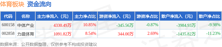 从资金流向上来看,当日体育板块主力资金净流入5422.31万元,游资资金净流出1.57万元,散户资金净流出5420.74万元。体育板块个股资金流向见下表: