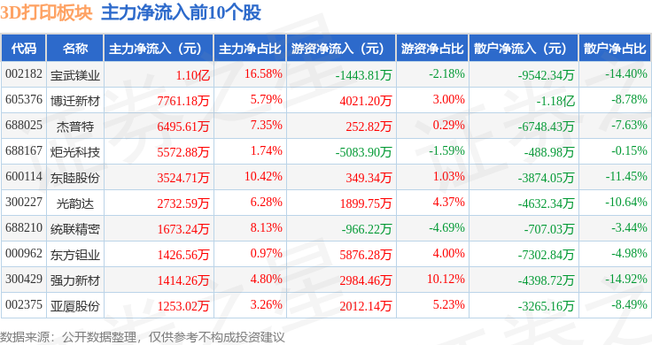 从资金流向上来看,当日3D打印板块主力资金净流出6.18亿元,游资资金净流入5.9亿元,散户资金净流入2772.41万元。3D打印板块个股资金流向见下表: