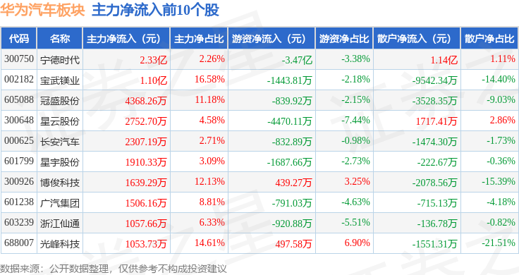 从资金流向上来看,当日华为汽车板块主力资金净流出29.44亿元,游资资金净流入7.19亿元,散户资金净流入22.26亿元。华为汽车板块个股资金流向见下表: