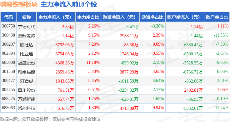 从资金流向上来看,当日磷酸铁锂板块主力资金净流出24.38亿元,游资资金净流入6.57亿元,散户资金净流入17.81亿元。磷酸铁锂板块个股资金流向见下表:
