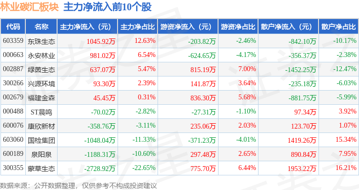 从资金流向上来看,当日林业碳汇板块主力资金净流出9763.41万元,游资资金净流入527.96万元,散户资金净流入9235.45万元。林业碳汇板块个股资金流向见下表: