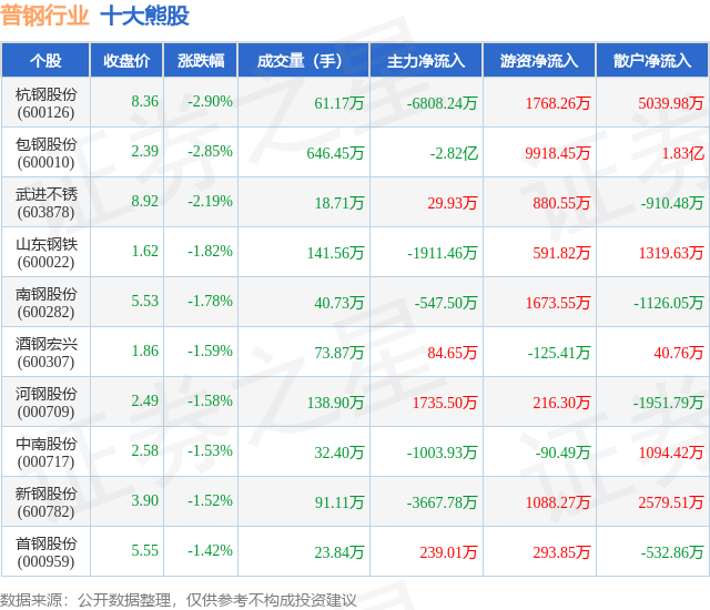 个股表现方面,普钢行业当日领跌股为杭钢股份(600126),该股当日报收8.36,下跌2.9%,成交量61.17万,主力资金净流出6808.24万元。包钢股份(600010)以下跌2.85%紧随其后,该股当日成交量646.45万,主力资金净流出2.82亿元。除此之外,武进不锈(603878)、山东钢铁(600022)、南钢股份(600282)均进入当日熊股之列。具体个股列表见下表: