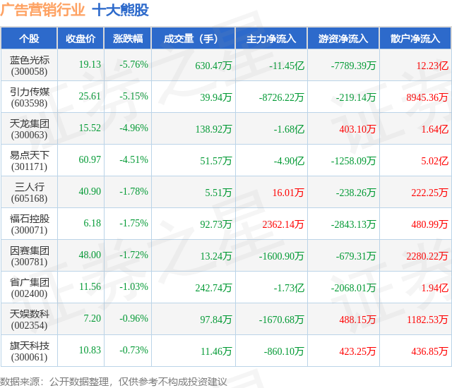 个股表现方面,广告营销行业当日领跌股为蓝色光标(300058),该股当日报收19.13,下跌5.76%,成交量630.47万,主力资金净流出11.45亿元。引力传媒(603598)以下跌5.15%紧随其后,该股当日成交量39.94万,主力资金净流出8726.22万元。除此之外,天龙集团(300063)、易点天下(301171)、三人行(605168)均进入当日熊股之列。具体个股列表见下表: