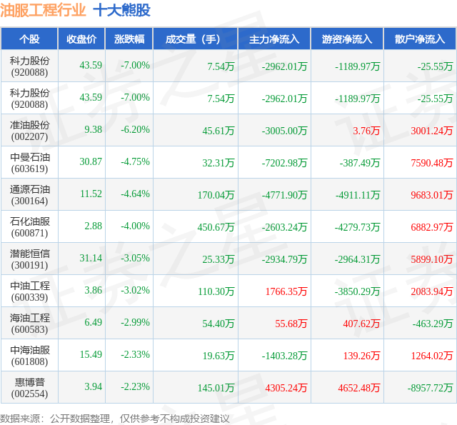 个股表现方面,油服工程行业当日领跌股为科力股份(920088),该股当日报收43.59,下跌7.0%,成交量7.54万,主力资金净流出2962.01万元。科力股份(920088)以下跌7.0%紧随其后,该股当日成交量7.54万,主力资金净流出2962.01万元。除此之外,准油股份(002207)、中曼石油(603619)、通源石油(300164)均进入当日熊股之列。具体个股列表见下表:
