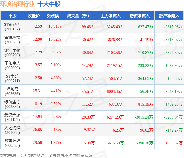 个股表现方面,环境治理行业当日领涨股为ST新动力(300152),该股当日报收2.59,上涨19.91%,成交量99.43万,主力资金净流入3245.4万元。雪浪环境(300385)以上涨16.32%紧随其后,该股当日成交量30.42万,主力资金净流入3676.88万元。除此之外,钱江生化(600796)、正和生态(605069)、ST京蓝(000711)均进入当日牛股之列。具体个股列表见下表: