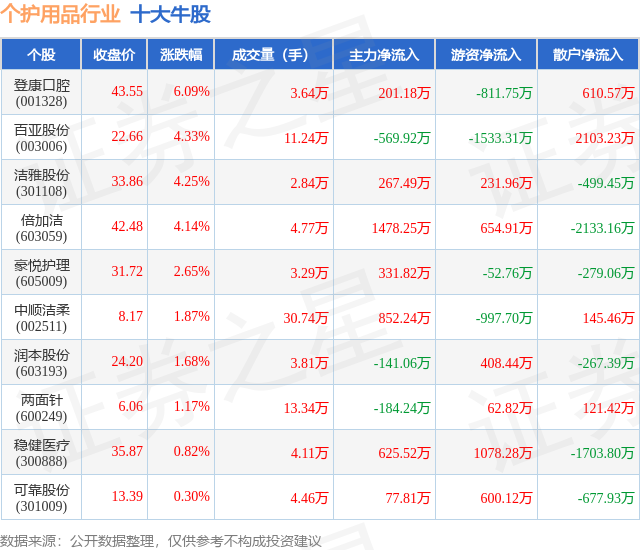 个股表现方面,个护用品行业当日领涨股为登康口腔(001328),该股当日报收43.55,上涨6.09%,成交量3.64万,主力资金净流入201.18万元。百亚股份(003006)以上涨4.33%紧随其后,该股当日成交量11.24万,主力资金净流出569.92万元。除此之外,洁雅股份(301108)、倍加洁(603059)、豪悦护理(605009)均进入当日牛股之列。具体个股列表见下表: