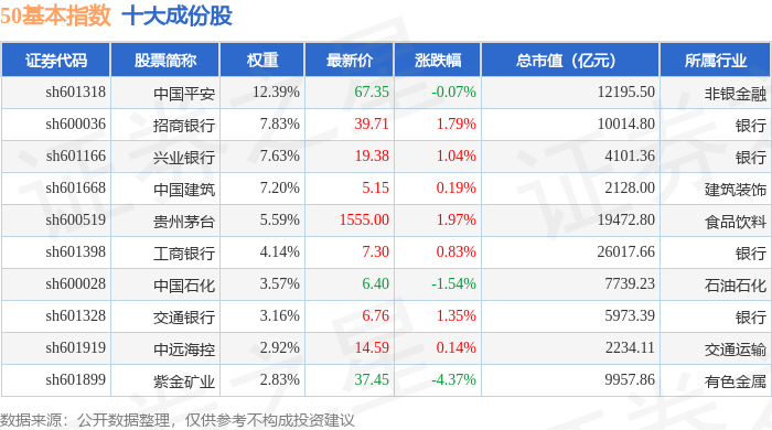 50基本(000052)指数十大成份股详情如下: