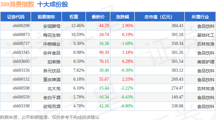 证券之星消息,2月5日,380消费(000108)指数报收于13049.97点,涨1.07%,成交79.62亿元,换手率1.69%。当日该指数成份股中,上涨的有8家,天味食品以7.32%的涨幅领涨,下跌的有9家,北大荒以2.22%的跌幅领跌。