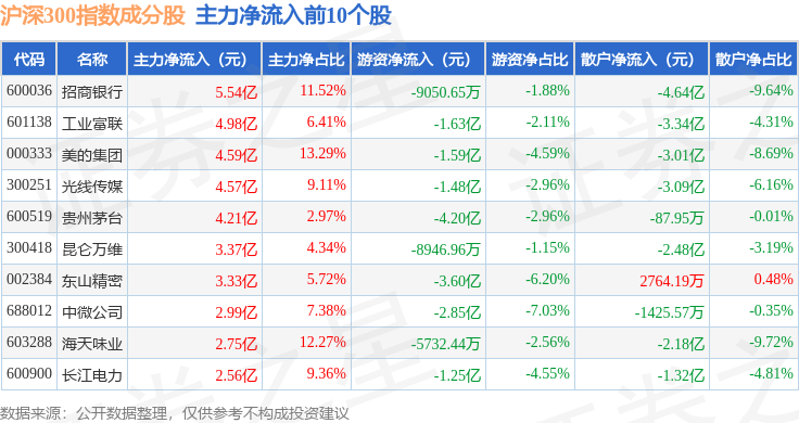 资金流向方面,沪深300(000300)指数成份股当日主力资金净流出合计214.6亿元,游资资金净流入合计41.13亿元,散户资金净流入合计173.47亿元。成份股资金流向详情见下表: