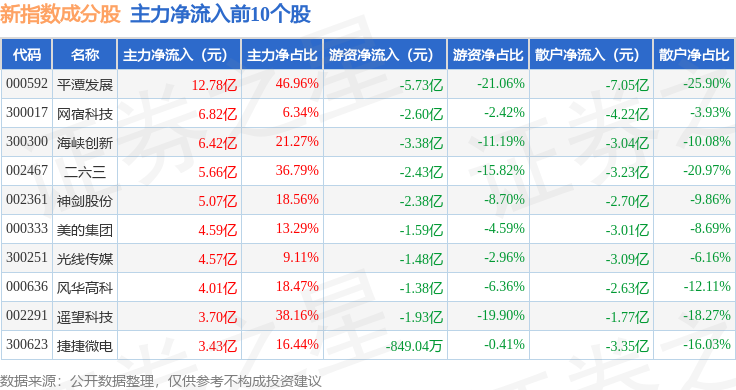 资金流向方面,新指数(399100)成份股当日主力资金净流出合计494.08亿元,游资资金净流入合计78.94亿元,散户资金净流入合计415.14亿元。成份股资金流向详情见下表: