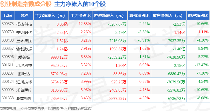资金流向方面,创业制造(399261)指数成份股当日主力资金净流出合计69.75亿元,游资资金净流入合计21.43亿元,散户资金净流入合计48.32亿元。成份股资金流向详情见下表: