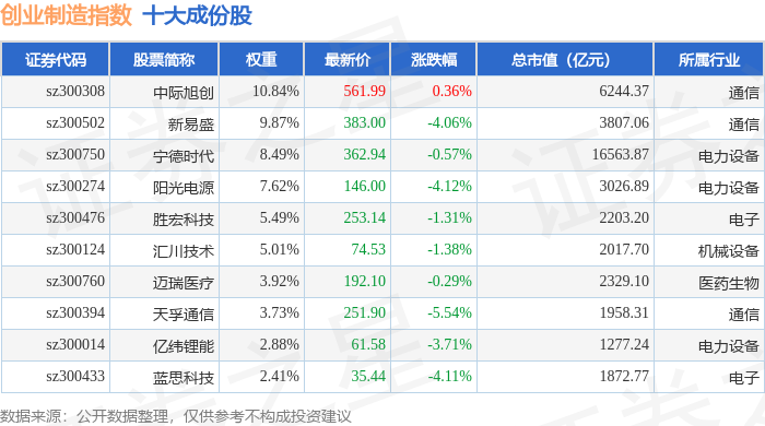 创业制造(399261)指数十大成份股详情如下: