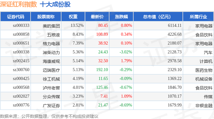 证券之星消息,2月5日,深证红利(399324)指数报收于9616.67点,跌0.51%,成交434.71亿元,换手率1.46%。当日该指数成份股中,上涨的有20家,老板电器以1.95%的涨幅领涨,下跌的有20家,铜陵有色以6.14%的跌幅领跌。