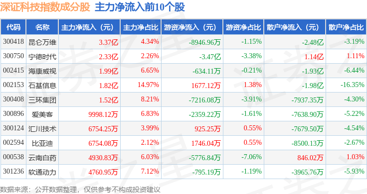 资金流向方面,深证科技(399339)指数成份股当日主力资金净流出合计123.53亿元,游资资金净流入合计30.76亿元,散户资金净流入合计92.76亿元。成份股资金流向详情见下表: