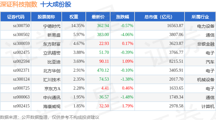 深证科技(399339)指数十大成份股详情如下: