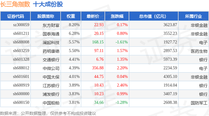 长三角(399355)指数十大成份股详情如下: