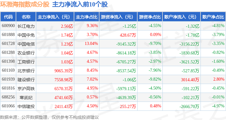 资金流向方面,环渤海(399357)指数成份股当日主力资金净流出合计5.51亿元,游资资金净流入合计3.37亿元,散户资金净流入合计2.14亿元。成份股资金流向详情见下表: