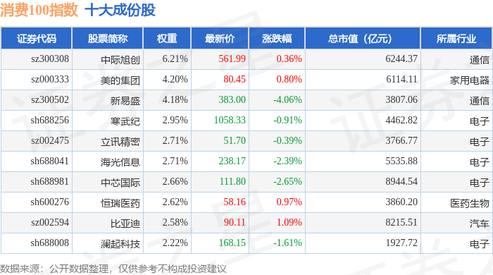 证券之星消息,2月5日,消费100(399364)指数报收于10732.7点,跌0.57%,成交2316.11亿元,换手率1.41%。当日该指数成份股中,上涨的有47家,光线传媒以9.0%的涨幅领涨,下跌的有53家,中天科技以7.29%的跌幅领跌。
