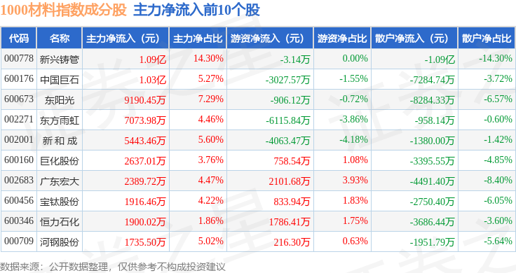 资金流向方面,1000材料(399382)指数成份股当日主力资金净流出合计182.4亿元,游资资金净流入合计39.65亿元,散户资金净流入合计142.75亿元。成份股资金流向详情见下表: