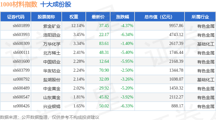 1000材料(399382)指数十大成份股详情如下: