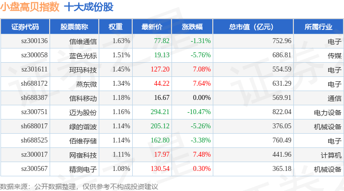 证券之星消息,2月5日,小盘高贝(399409)指数报收于7137.24点,跌1.73%,成交1787.32亿元,换手率4.53%。当日该指数成份股中,上涨的有30家,风华高科以9.99%的涨幅领涨,下跌的有118家,捷佳伟创以12.39%的跌幅领跌。