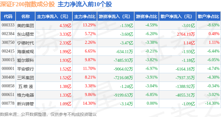 资金流向方面,深证F200(399703)指数成份股当日主力资金净流出合计107.05亿元,游资资金净流入合计12.42亿元,散户资金净流入合计94.64亿元。成份股资金流向详情见下表: