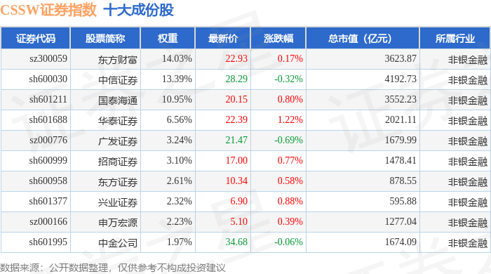 CSSW证券(399707)指数十大成份股详情如下: