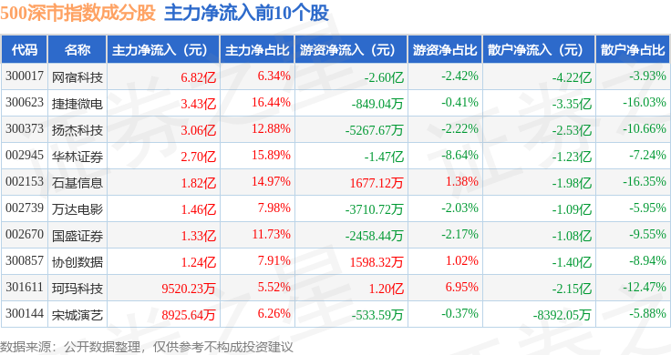 资金流向方面,500深市(399802)指数成份股当日主力资金净流出合计139.87亿元,游资资金净流入合计31.62亿元,散户资金净流入合计108.25亿元。成份股资金流向详情见下表: