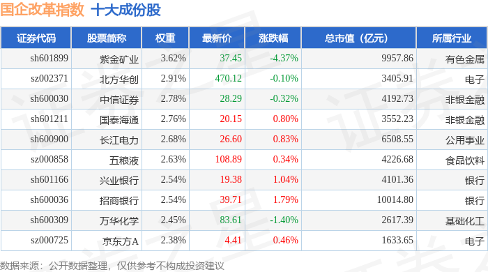 证券之星消息,2月5日,国企改革(399974)指数报收于1972.38点,跌0.69%,成交1710.44亿元,换手率0.87%。当日该指数成份股中,上涨的有42家,片仔癀以4.0%的涨幅领涨,下跌的有56家,金风科技以9.02%的跌幅领跌。