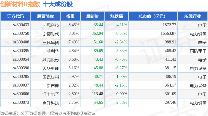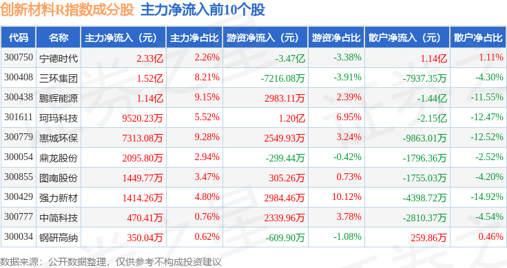 资金流向方面,创新材料R(470039)指数成份股当日主力资金净流出合计18.69亿元,游资资金净流入合计5.24亿元,散户资金净流入合计13.45亿元。成份股资金流向详情见下表: