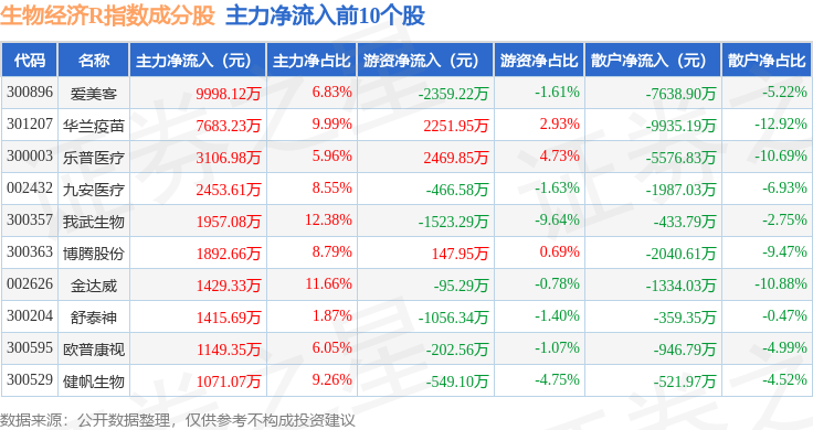 资金流向方面,生物经济R(470038)指数成份股当日主力资金净流出合计4.27亿元,游资资金净流入合计3.3亿元,散户资金净流入合计9697.8万元。成份股资金流向详情见下表: