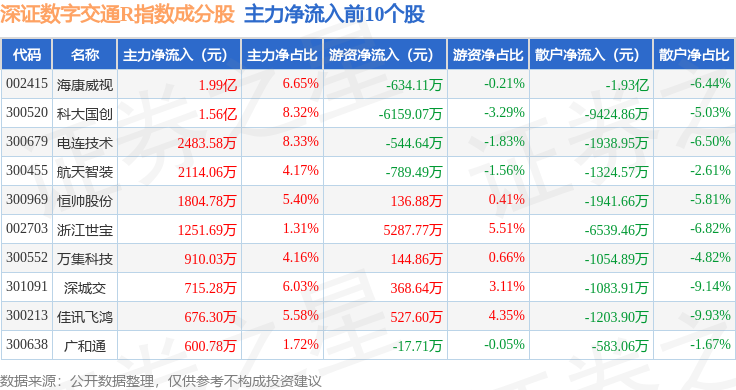 资金流向方面,深证数字交通R(470049)指数成份股当日主力资金净流出合计1.58亿元,游资资金净流入合计9941.06万元,散户资金净流入合计5842.3万元。成份股资金流向详情见下表: