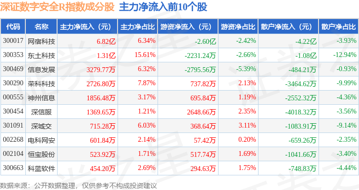 资金流向方面,深证数字安全R(470052)指数成份股当日主力资金净流出合计4.55亿元,游资资金净流出合计2867.73万元,散户资金净流入合计4.83亿元。成份股资金流向详情见下表: