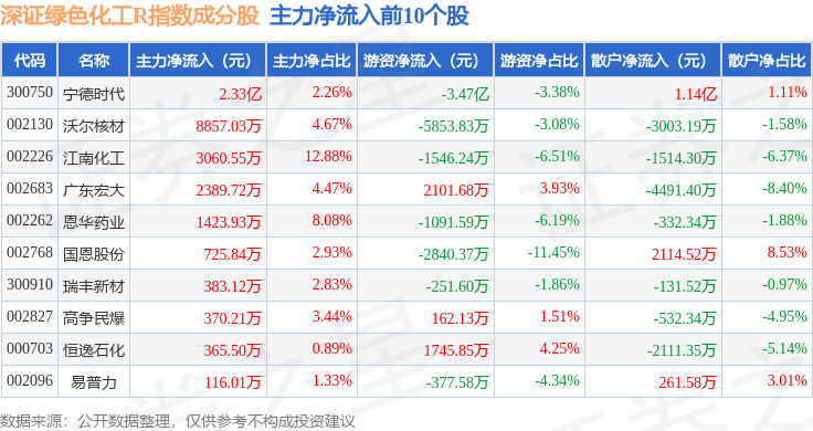 资金流向方面,深证绿色化工R(470076)指数成份股当日主力资金净流出合计18.14亿元,游资资金净流入合计1.61亿元,散户资金净流入合计16.53亿元。成份股资金流向详情见下表: