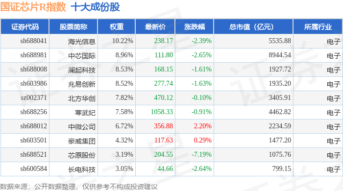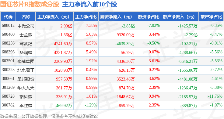 资金流向方面,国证芯片R(480017)指数成份股当日主力资金净流出合计30.12亿元,游资资金净流入合计15.36亿元,散户资金净流入合计14.77亿元。成份股资金流向详情见下表: